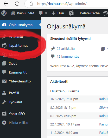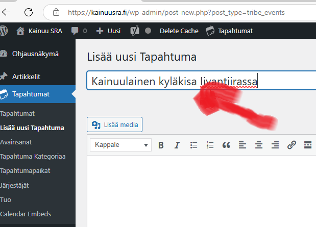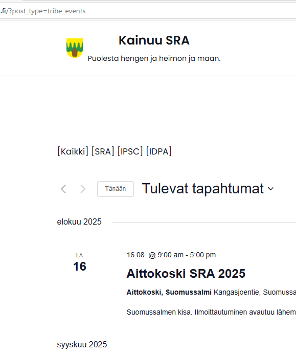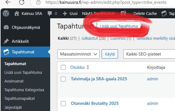 Mene lopuksi kainuusra.fi sivulle ja klikkaa tapahtumat. Varmista että oma tapahtumasi näkyy ja kaikki tiedot on oikein. Tarvittaessa käy ja muokkaa tarvittavat korjaukset.