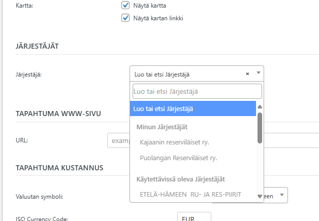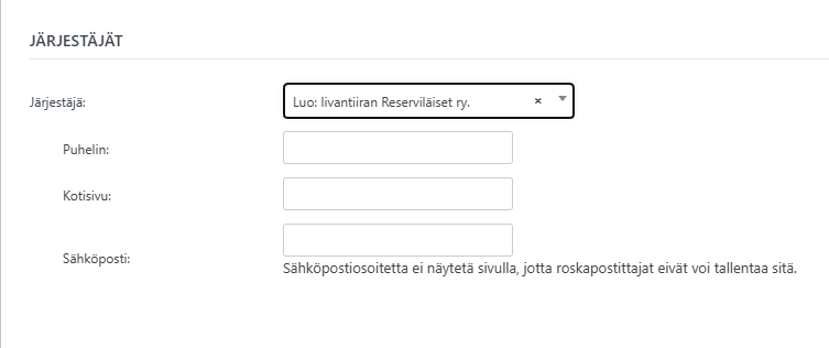 Valitse järjestäjä, ellei sitä ole listalla niin luo uusi: