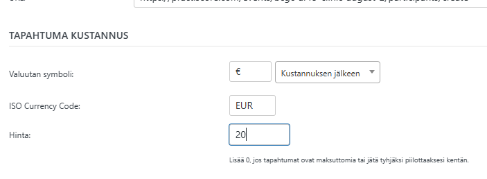 Kustannukseen laita 0 tai osallistumismaksun suuruinen summa.