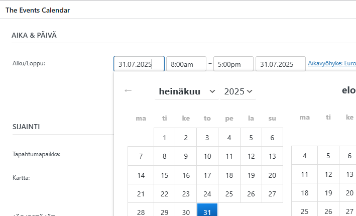 Valitse tapahtuman alku- ja loppuaika (päiväys ja kellonajat):