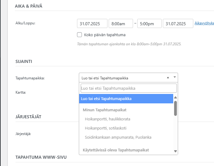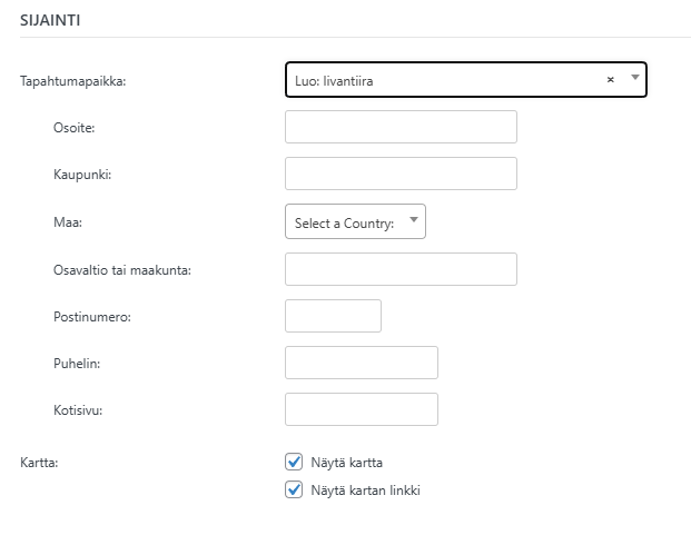 Valitse tapahtumapaikka, ellei sitä ole listalla niin luo uusi: